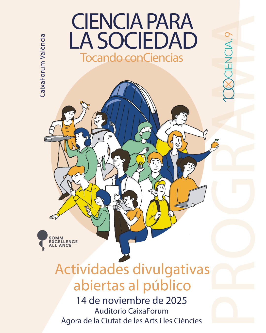 València is getting ready for a unique afternoon in which science will become a participatory experience for the whole family. On November 14, the 100xCiencia.9 congress, organized by the SOMMa Alliance (the Alliance of Severo Ochoa and María de Maeztu Centers of Excellence), will open its doors to the public at the CaixaForum València auditorium and the Àgora space of the Ciutat de les Arts i les Ciències. The event offers an attractive and innovative program that combines talks, experiments, theatre, and music to bring research closer to society.