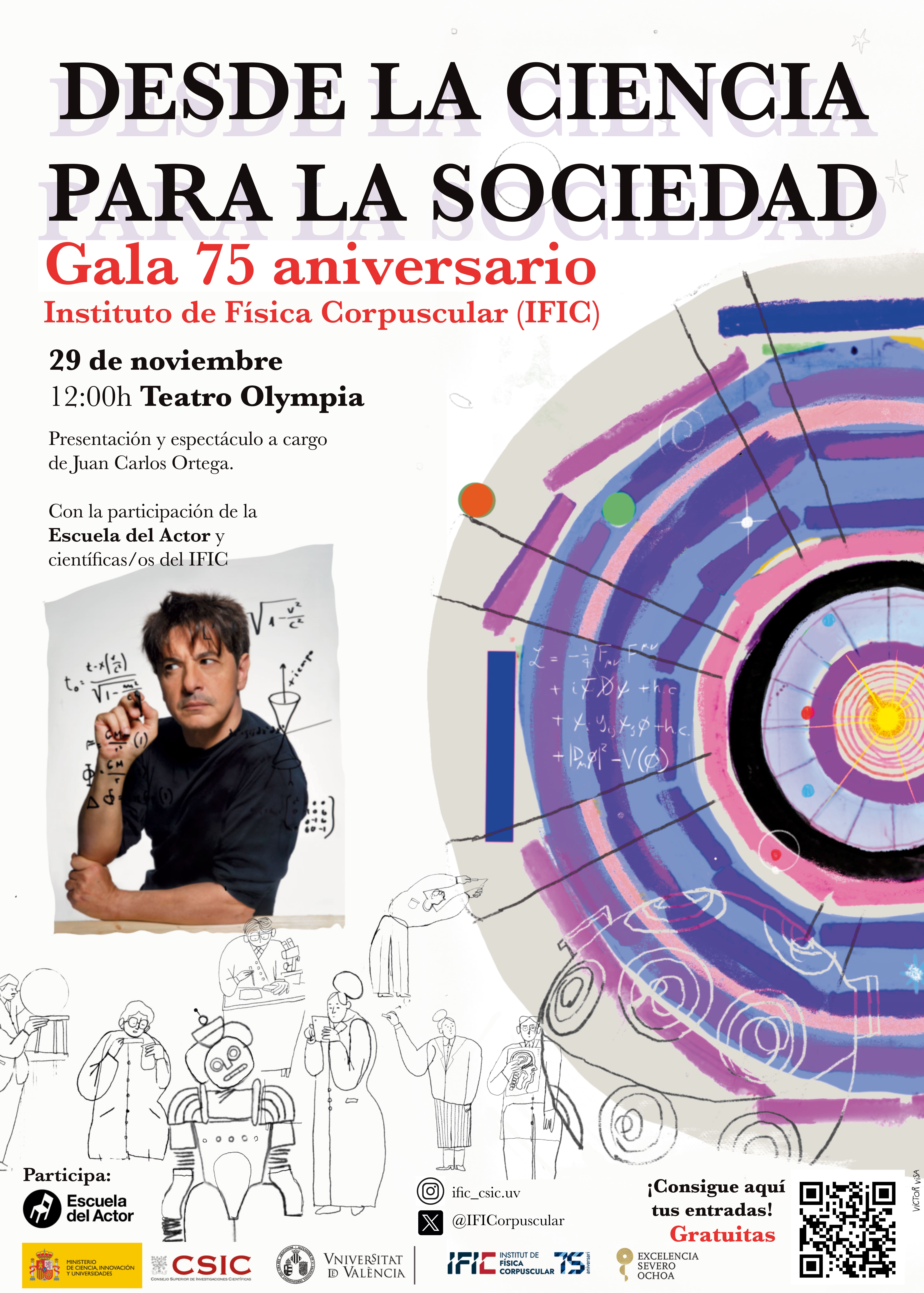 “Des de la ciència per a la societat” és el títol d’aquesta gala-espectacle oberta al públic, una expressió que reflecteix l’essència i els objectius de l’IFIC: acostar els seus estudis i investigacions a tota la ciutadania. Conduït per l’humorista i apassionat de la ciència Juan Carlos Ortega, aquest espectacle està concebut com una celebració, amb una successió d’actes on es parlarà dels orígens de l’IFIC, hi participaran alguns dels seus investigadors i investigadores, i culminarà amb un espectacle en clau d’humor sobre el món de la física de partícules. Ortega, conegut pel programa de ràdio “Les Nits d’Ortega” i per les seues nombroses aparicions en televisió, exercirà de mestre de cerimònies i oferirà un número final que, sens dubte, sorprendrà tot el públic. El locutor, escriptor i humorista es descriu com “una persona que fa coses a la ràdio, algunes de les quals són comèdia (però no totes)”; amb aquest to, la gala-espectacle vol oferir un format innovador dins dels espectacles creats per un institut d’investigació.