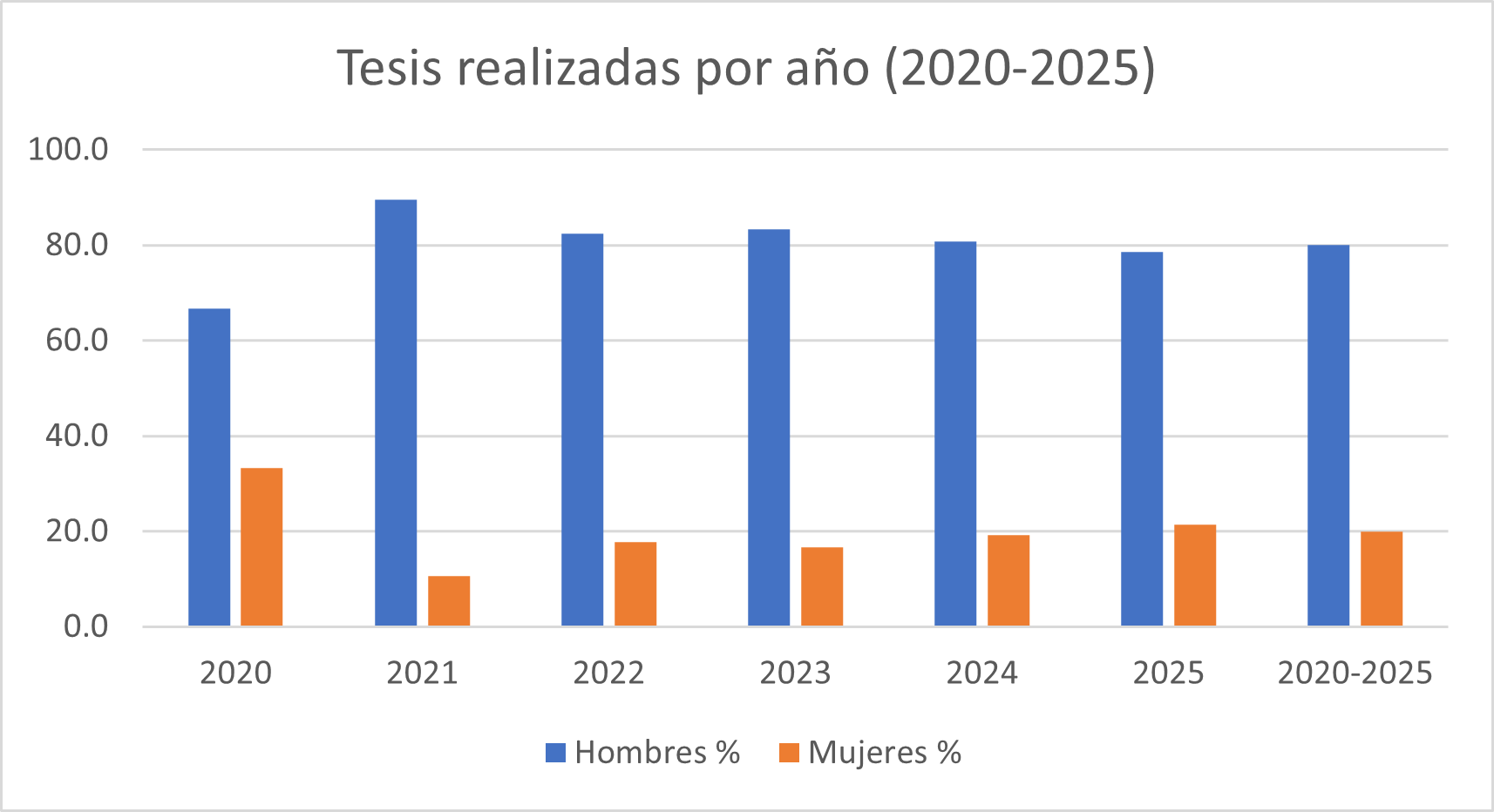 Tesis realizadas por género y por año en desde 2020 a 2025: