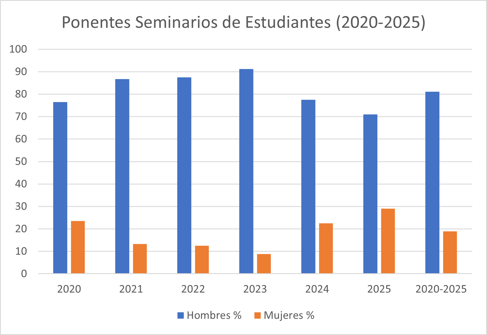 Distribución por género de ponentes de seminarios de estudiantes en el IFIC desde 2020 a 2025: